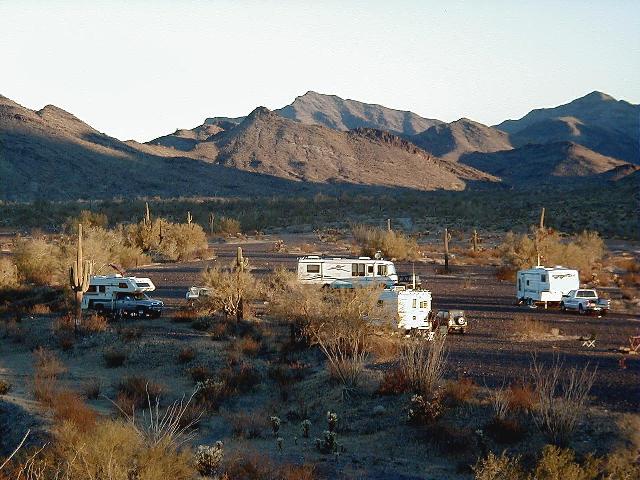 This was our camping spot New Years Day 2002. We are currently outside of Vicksburg, AZ. We are 5-6, miles off the pavement and we and our friends spent several weeks here "bumming" around the desert. The bottom of the page has a link to our petroglyph page where you can see some of the Indian Petroglyphs that we found "way back." These are not on any of your tourist maps.
