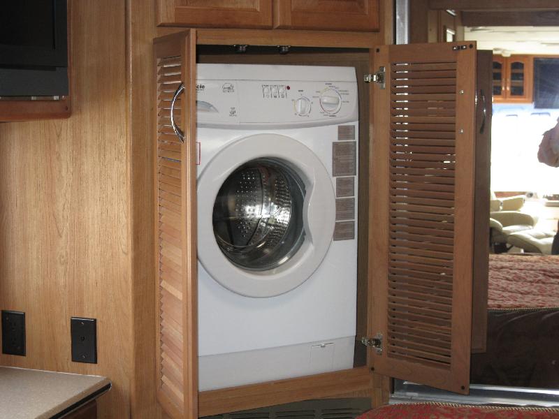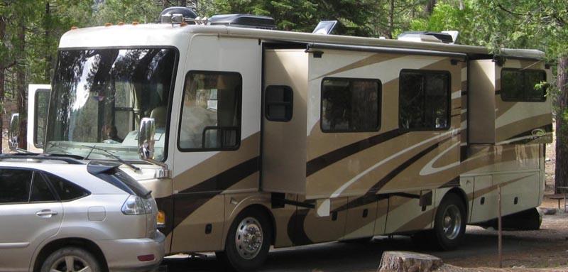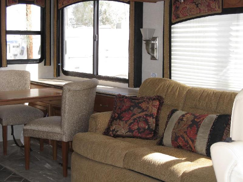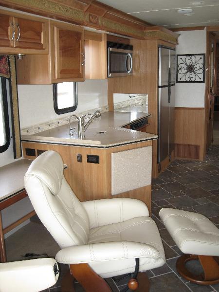 It's a 2008 National RV Pacifica. It is a 36' diesel pusher with 3 slides sitting on a freightliner chassis. It has a 360Hp Cummins Turbo Diesel with an Allison 6 speed automatic transmission and it pulls Jan's car up hills no problem. For dry "camping" it has an 8Kw Onan genset. It also has some nice "little" features like rear facing cameras not just in the back but also in each side mirror, 2 digital flat screen TV's (we have never used the one in the bedroom), Corian countertops and it even has an actual slate floor! Guess they weren't worried about extra weight! Quite a change from a 10' 9" Cabover Camper, huh?