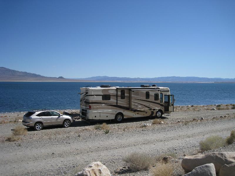 Parked alongside Walker Lake with Jan's car in tow